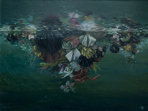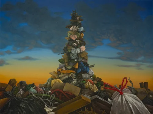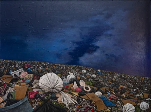 In this series, Penchant, I am exploring our culture's obsession with consumption and waste by analyzing our relationship with garbage. Through artifacts left behind by great societies throughout history, we can determine how cultures lived and what they most valued. How will future societies view us? What will they conclude about the way we attempted to solve our problems? I believe a society built on convenience and individualism will be found, since our layer in time will be filled with unsustainable waste. I paint our blind relationship with the things we throw out to bring a more mindful awareness to the ways we consume - a theme rarely discussed in gallery settings. Through experimentation with color and texture, threatening piles of trash evoke feelings of curiosity and playfulness while creating a sense of foreboding doom. While acidic skies and towers of trash teeter on the edge of eruption, the viewer is still able to find comfort within these treasures. Penchant bridges gaps and invites everyone to the same page by demonstrating an immediate level of impact on climate change in our daily lives. This series brings to light our relationship with waste in hopes of convincing others that even through the endless social and economic issues compounding around us, our planet is always of the utmost importance.