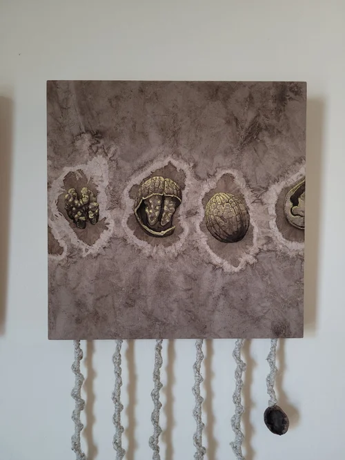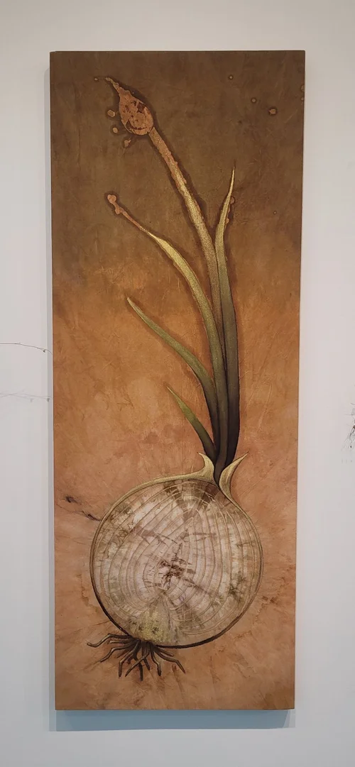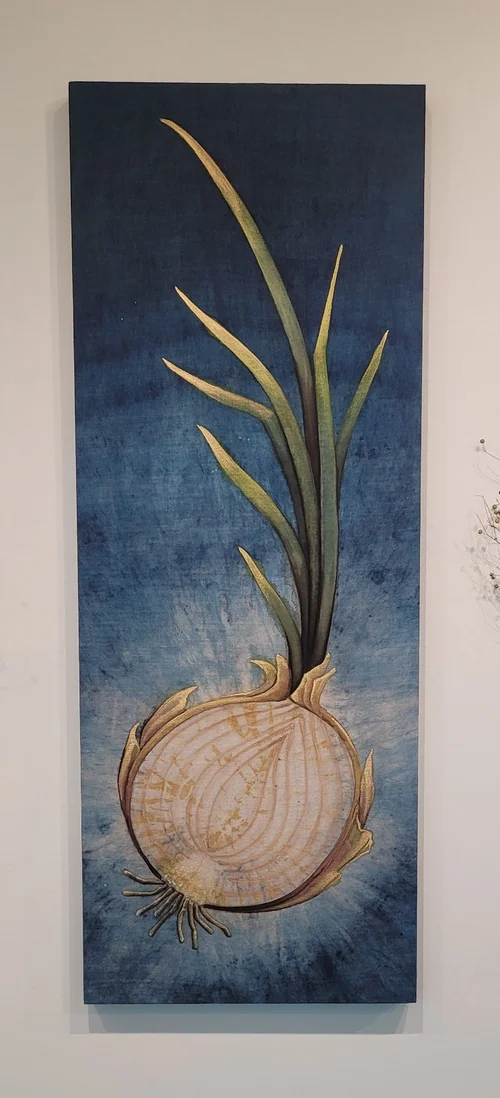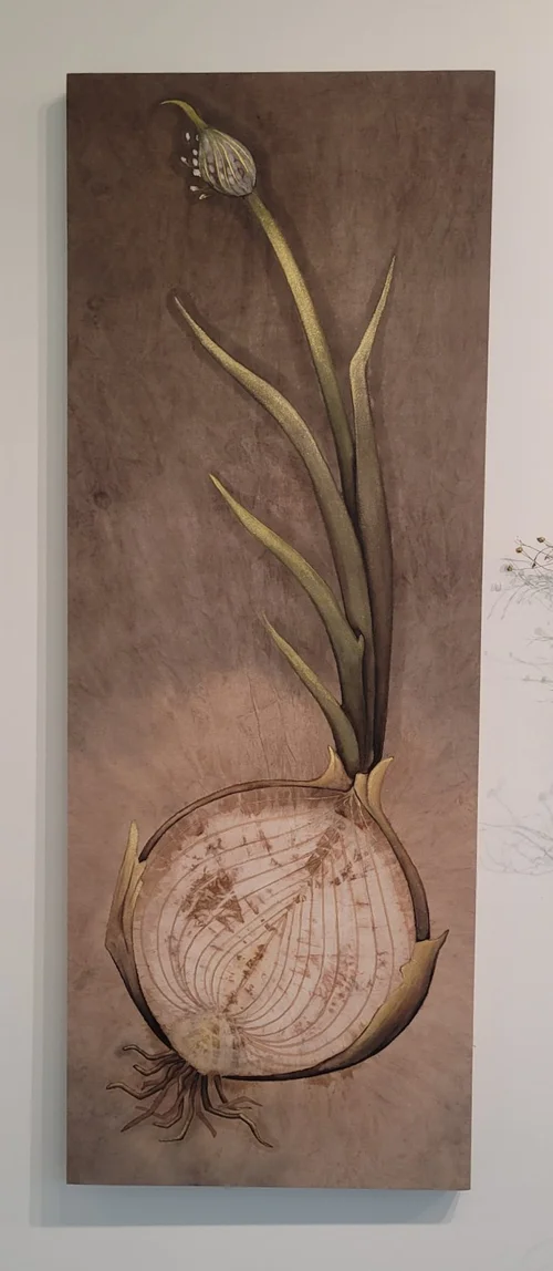 A series of six onion paintings created using homemade dyes and paints made with onion skins, avocado, sappan-wood, iron, indigo, logwood, walnut ink, and mica paint from Beam Paints.